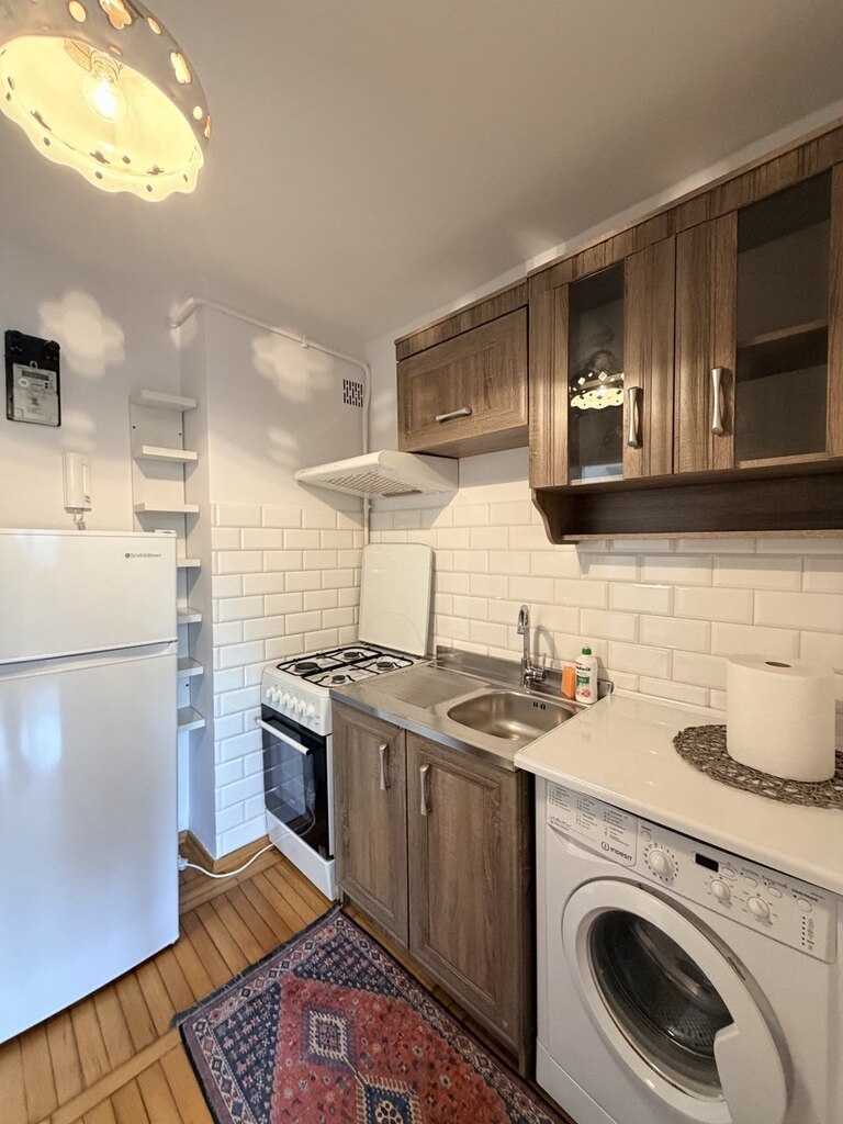 Studio apartment for rent, approximately 27 square meters, located on the third floor. The apartment consists of a room, kitchen, bathroom, and hallway. It is fully furnished. The kitchen is equipped with all necessary appliances. The bathroom has a shower and a washing machine.